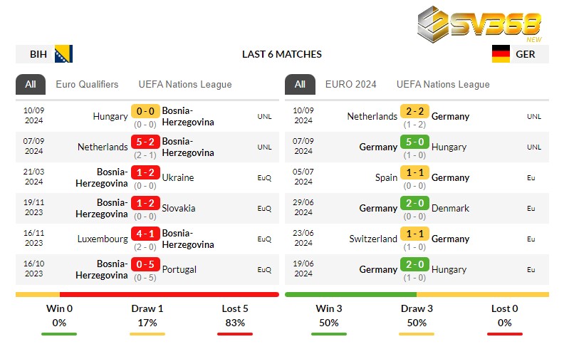Phong độ thi đấu 6 trận đấu mới đây của Bosnia và Đức